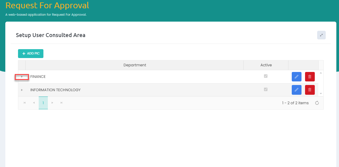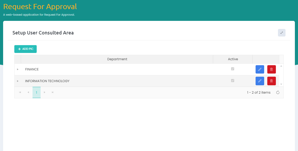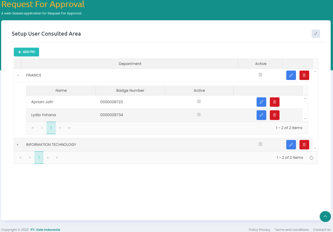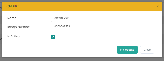 Form ini digunakan oleh Administrator untuk manage PIC di setiap Department.